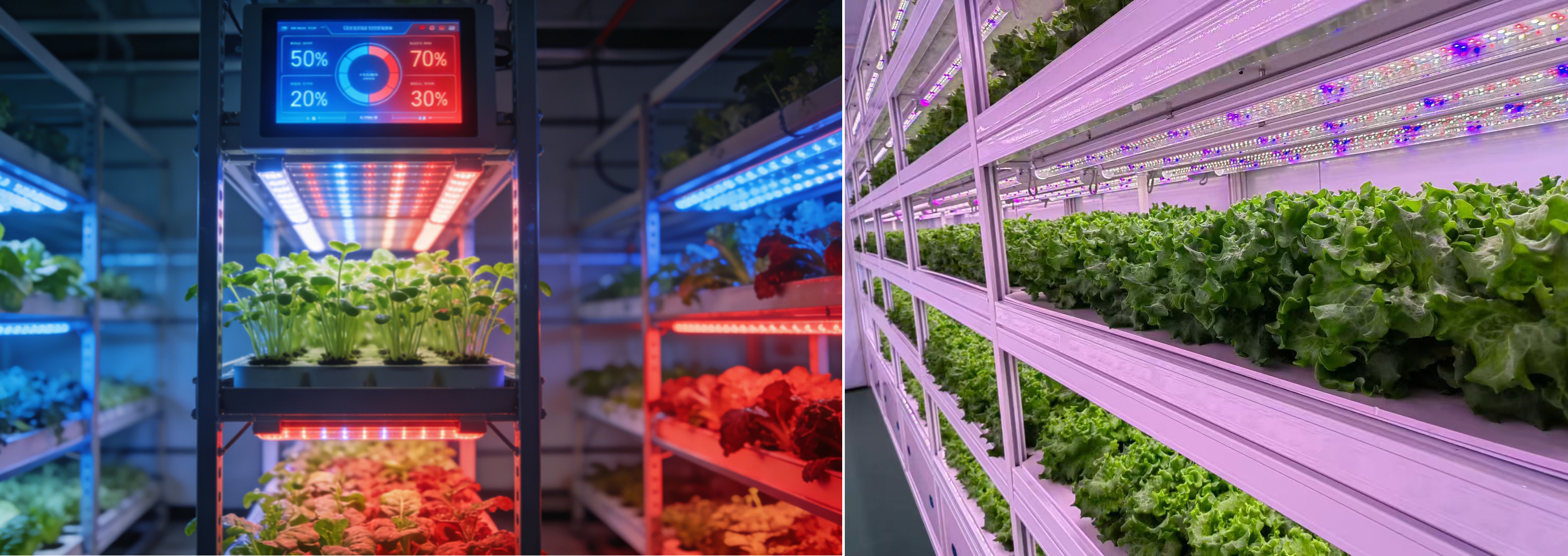 就拿生菜種植來說,在自然環境中,從播種到收獲需要45~60天,且受光照影響,同一批次生菜長勢不均。而在植物工廠里,搭配定制化植物種植燈,通過調控光照時長(每天 12-16 小時穩定光照)和光譜比例,生菜需要25-28天長到120克左右,能保證每一顆葉片肥厚、口感脆嫩,產量更是傳統種植的 3-5 倍。對植物工廠而言,植物種植燈不是 “替代品”,而是實現 “可控化、高效化” 生產的 “必需品”,沒有它,就沒有全年無休的新鮮蔬菜供應。