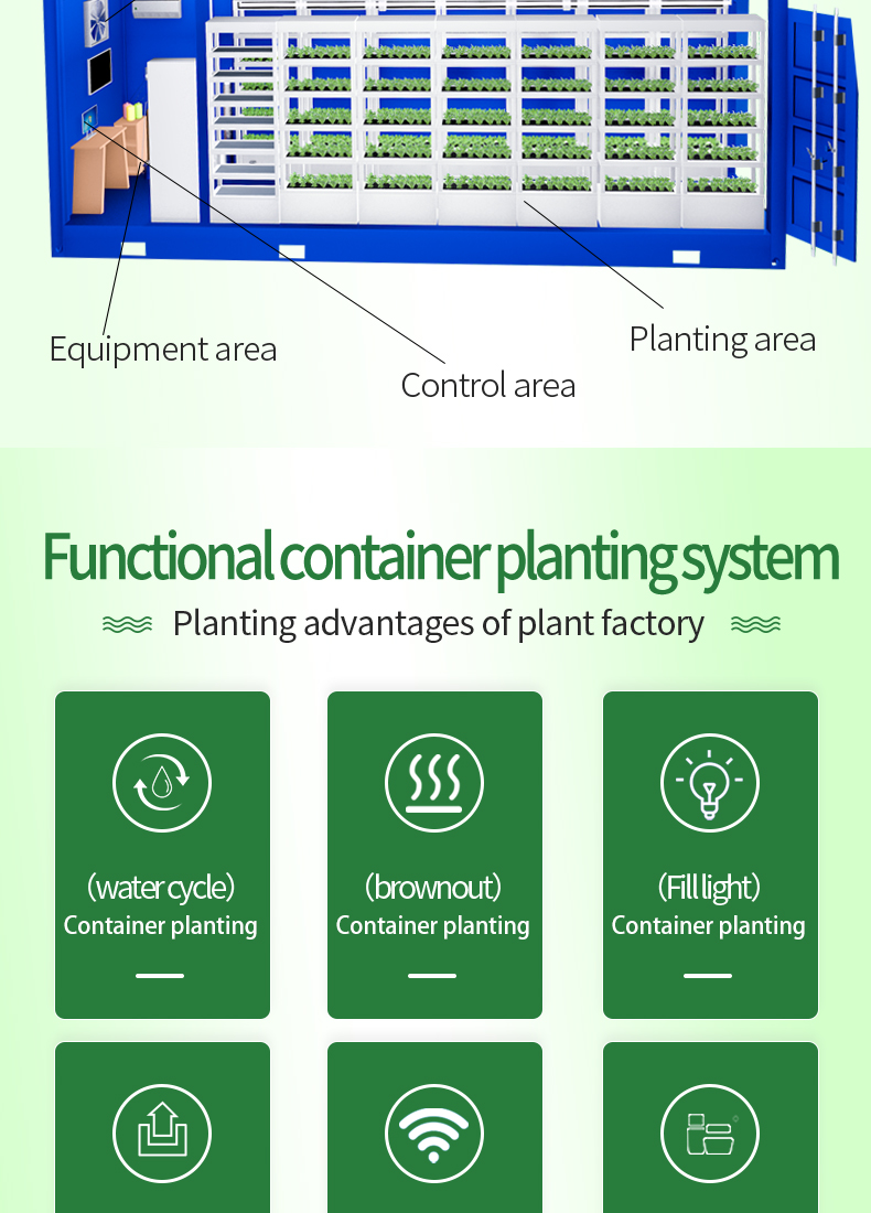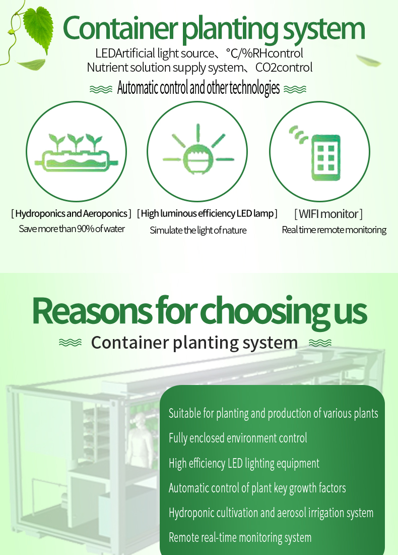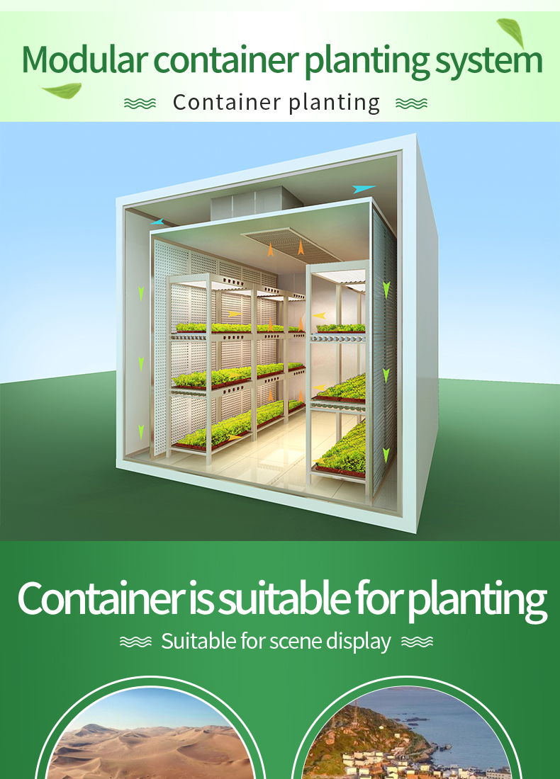 This hydroponic plant system is an efficient method of growing plants without soil. The system provides nutrients to plants suspended in a closed enThe container plant factory is an innovative agricultural production model that places the plant planting and growth process in containers. This kind of factory usually uses advanced control systems, including automatic irrigation, light control, temperature and humidity regulation, etc., to simulate the environmental conditions most suitable for plant growth. Advantages of this plant factory include: Location flexibility: Containerized plant factories can be established anywhere in the city without the need for large tracts of land, thereby being closer to markets and reducing transportation costs and energy consumption. Seasonal independence: Due to the control of the indoor environment, this kind of factory can produce crops at any time throughout the year without seasonal restrictions. High water resource utilization efficiency: By recycling water resources and precise irrigation control, containerized plant factories can achieve efficient use of water resources. High yield and quality stability: Due to the high degree of environmental control, this type of plant can achieve high yield and crop quality stability, thereby improving production efficiency and quality consistency. Reduced Pesticide Use: Indoor environments can more easily control the spread of pests and diseases, thus reducing the use of pesticides.