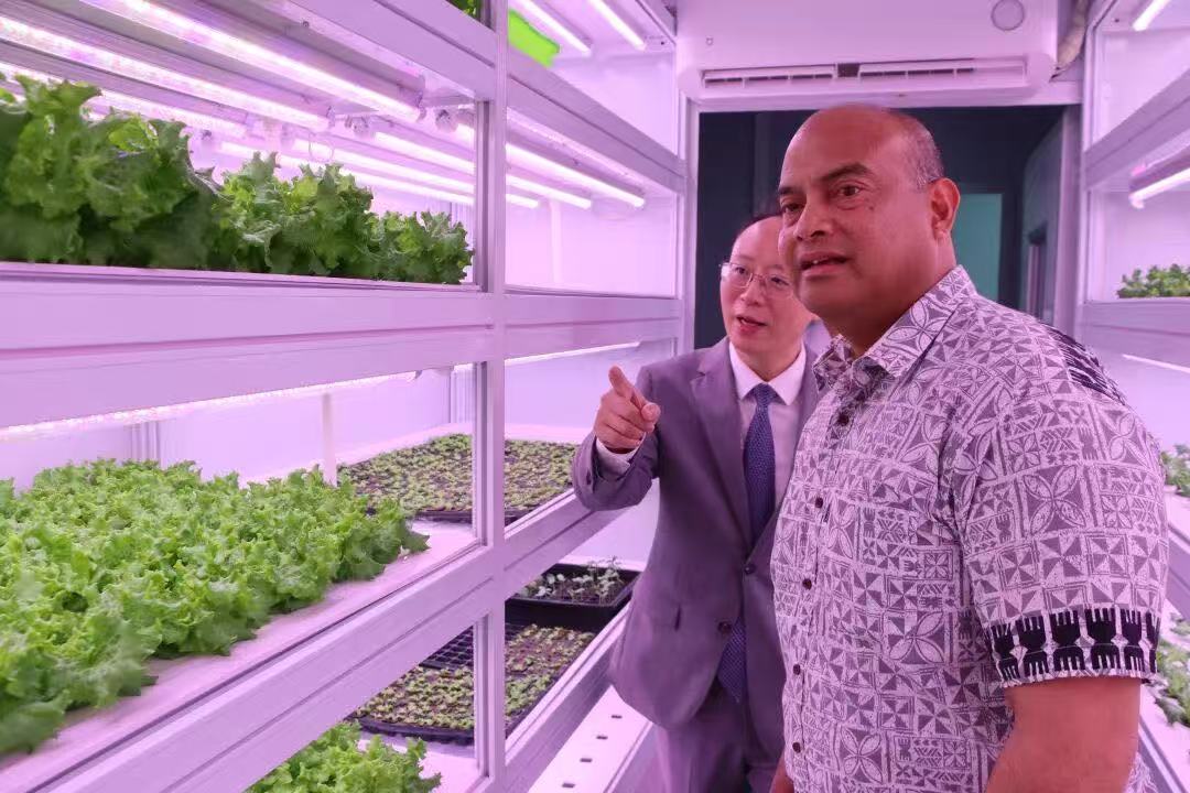 在種植技術上,采用奧瑪農業自主研發的無土栽培技術與營養液配方,不依賴貧瘠的本土土壤,同時實現水資源循環利用,既契合瑙魯的生態保護需求,又大幅降低種植的資源消耗。項目投產后,每月可穩定產出生菜、菠菜等多種綠葉蔬菜,直接覆蓋瑙魯部分社區的日常蔬菜需求,讓當地居民告別 “吃菜難”,吃上新鮮、平價的本土種植蔬菜。瑙魯總統阿迪昂親手采摘品嘗工廠種植的生菜后連連稱贊,直言這是 “中瑙友誼的果實”,這份來自中國的農業科技,真正走進了當地民眾的生活。